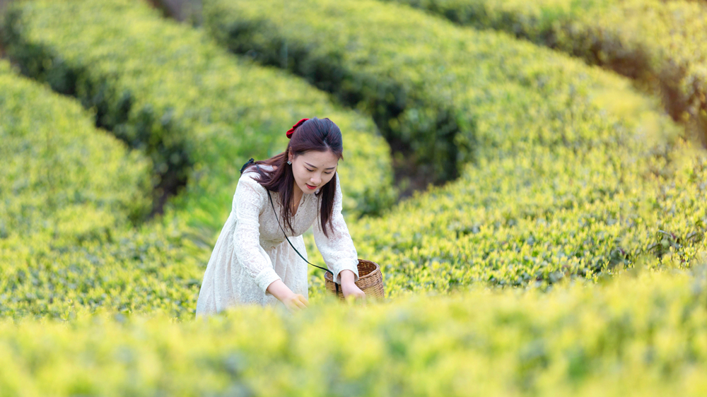 一名少女在旺苍木门镇三合现代农业园采摘广元黄茶。李彬摄