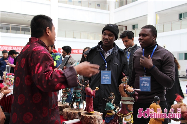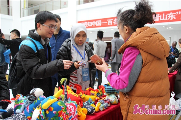 在文体展厅内,刘氏布偶、曹文忠剪纸、乐安苇编、东营区面塑、史口艾家衡器(杆秤)制作技艺等10多个非遗项目也同期向来华留学生进行了展演和展示,会场内各国学生争相问询,热闹非凡。