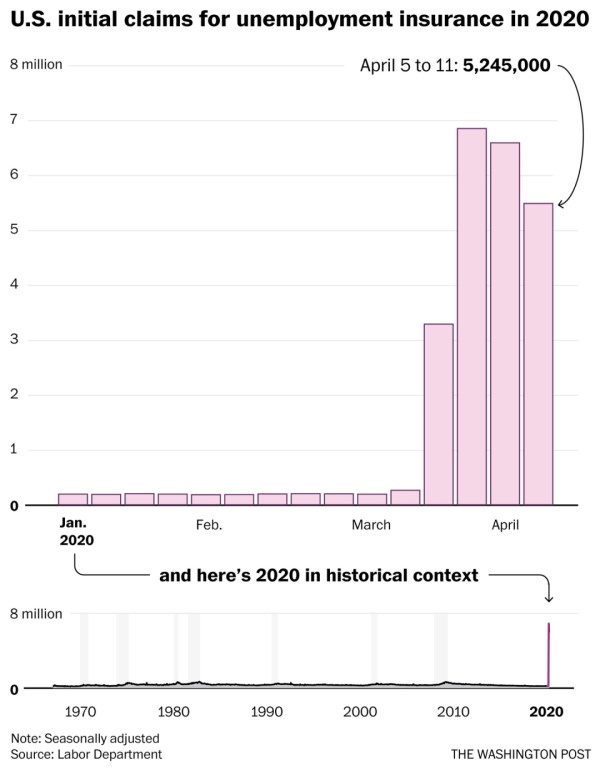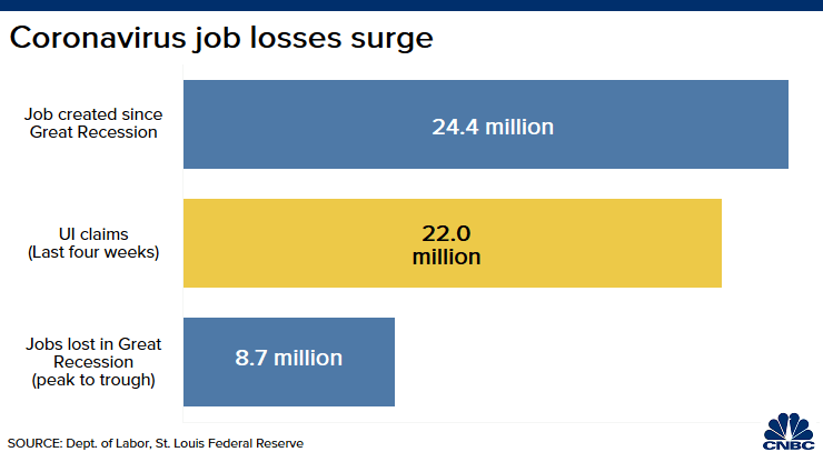 即便如此,官方数据可能还是低估了已经停止工作的人员规模。虽然一些员工被遣送回家,但他们仍在领薪水。美国联邦政府2.2万亿美元的巨额救助计划将帮助航空公司和小型企业向员工支付几个月的薪水,这人为地拉低了官方失业率。