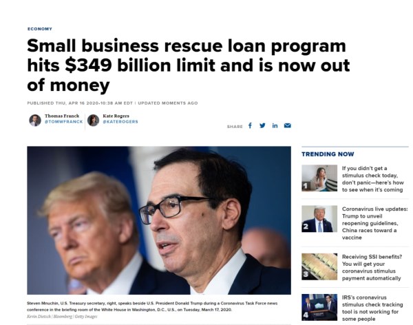 据CNBC报道,美国3500亿美元中小企业救助金已用尽,近期超过160万中小企业申请帮助。