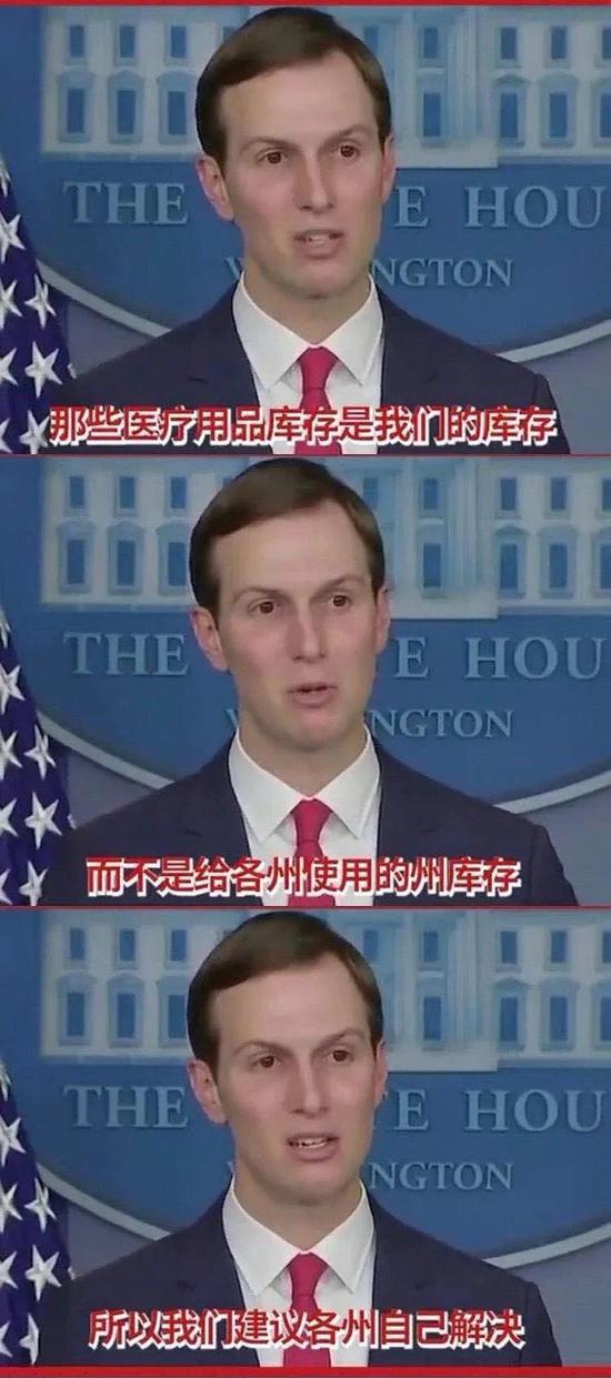 4月2日,库什纳在疫情简报会上首次露面。面对各州州长抱怨医疗物资紧缺却没从联邦政府获得支持,他却玩起了文字游戏: