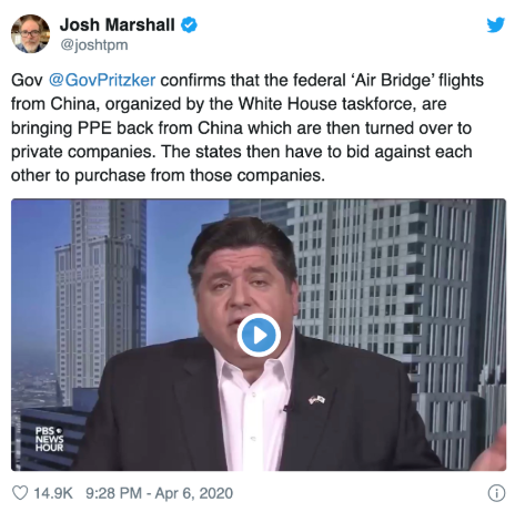 伊利诺伊州长普里茨克接受采访时说:“就像拍卖会那样,你必须跟其它50个其它州一起竞拍,才有可能从这些公司手里买到救灾物资。”