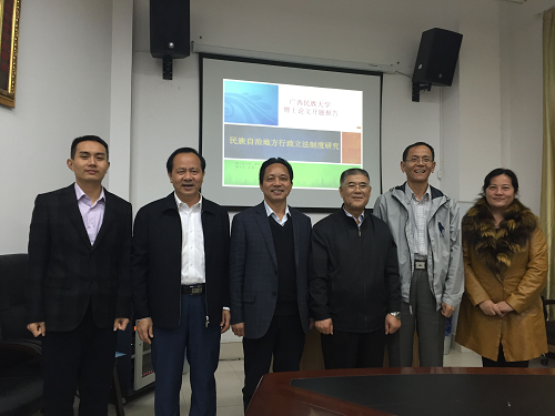 2016年11月10日,宋才发教授在广西民族大学主持2015级法学博士生彭振的开题报告,与广西民族大学校长谢尚果教授(右1)、蒋慧教授(左1)、清华大学高其才教授(左2)、中央民族大学匡爱民教授(右2)在一起