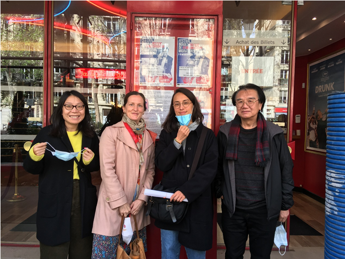 (从左至右依次为:巴黎塞尔吉-蓬图瓦兹大学教师杜娟、法国国家科研中心巴黎政治学院国际研究中心研究员Hélène Le Bail、《广东炒饭》导演Mia Ma、法国留尼旺大学社会学副教授Live Yu-Sion,摄于2020年10月11日 巴黎十三区L’ESCURIAL影院)
