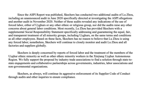 在澳大利亚战略政策研究所发布了关于新疆劳工的调查报告后,斯凯奇又专门进行了两次突击检查,两次检查都没有发现任何问题,基于这些事实,斯凯奇没有理由相信相关企业强迫维吾尔族工人劳动。维吾尔族工人与其他所有员工一样,享有平等,公平和透明的待遇。
