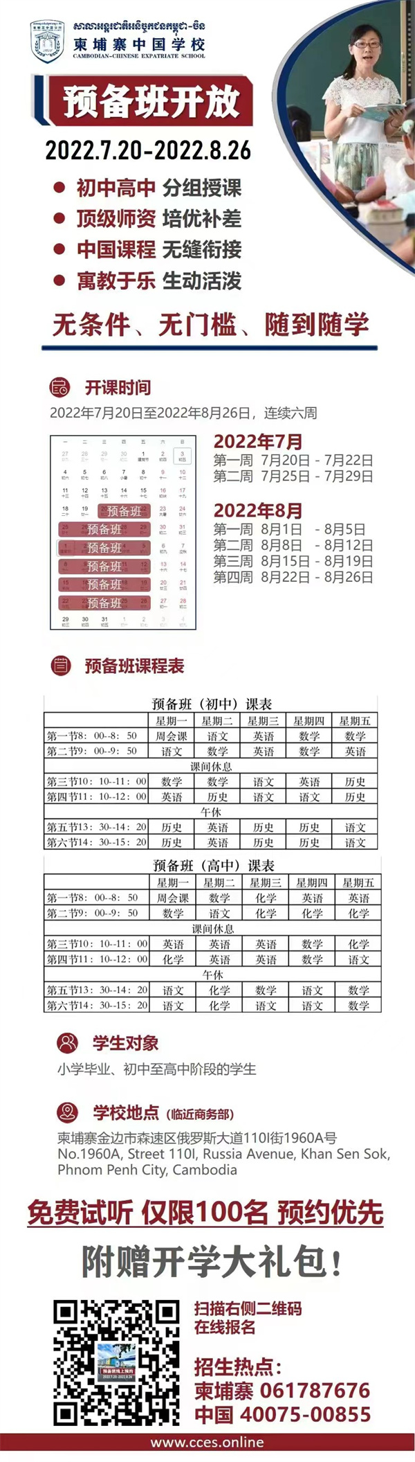 据柬埔寨中国学校微信公众号“CCIS2021”,培养学生的"传统价值,国际视野"是柬埔寨中国学校的教学宗旨和目标。学校秉承“中西教育优化结合,实施素质教育”的办学理念,以“立德树人、宽厚包容、经世致用、开拓创新”为办学精神,坚持“德育为先、能力为重、全面发展、尊重个性”的育人导向,培养具有新时代社会责任感、全面综合素质的中国东盟国际精英人才。(完)