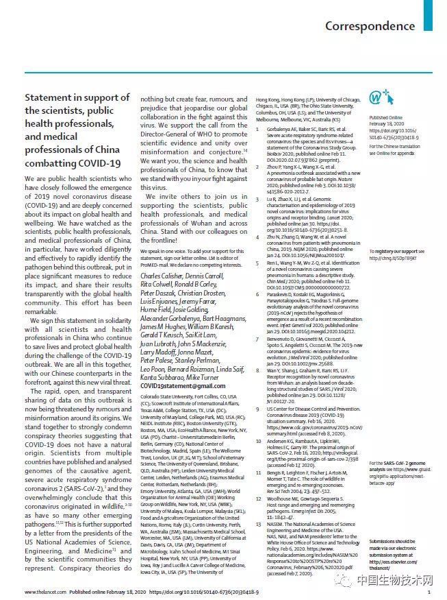 19日,来自美国、英国、德国、西班牙等国家近30名科学家在国际著名医学杂志《柳叶刀》网站发表声明,强烈谴责认为新型冠状病毒疾病COVID-19并非自然起源的阴谋论,对中国抗击COVID-19疫情中的科研、公共卫生、医务工作者予以支持。