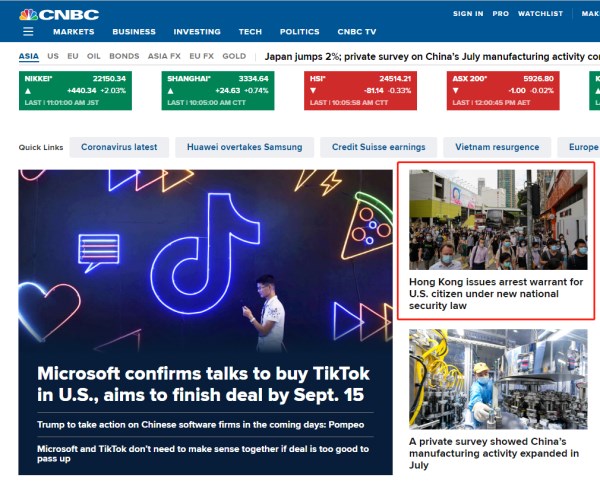 这篇题为“香港依据国安法通缉美国公民”的报道说,香港警队此前通缉了六名逃亡海外的乱港分子,其中一人在社交媒体上自称是美国公民,“已在美国生活25年”。他还宣称,“如果我成为目标,任何为香港发声的美国人都有可能成为目标。我们现在都是香港人!”