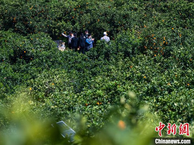 图为参访团走进奉节永乐镇大坝村脐橙园。(图片来源:中新社记者何蓬磊摄)