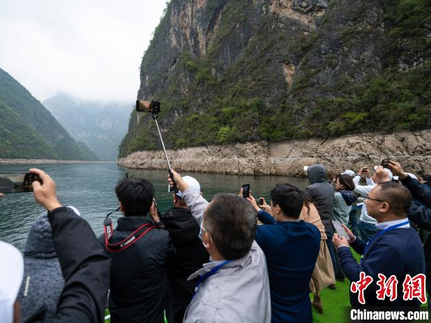 图为参访团乘船了解小三峡和小小三峡旅游开发情况。(图片来源:中新社记者何蓬磊摄)