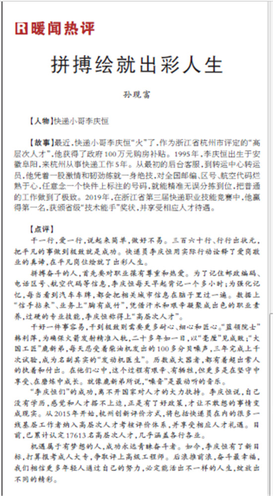 从2015年开始,杭州创新评价方式,将包括快递员在内的很多一线基层工作者纳入高层次人才考核评价体系,并享受相应人才礼遇。( 2020年11月09日 10 版)