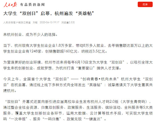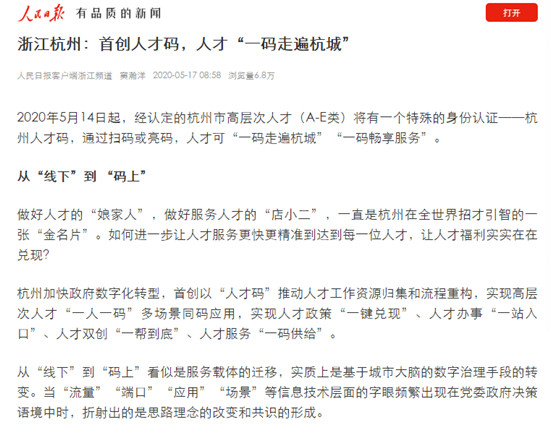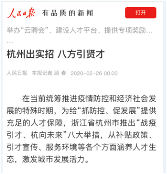 人民日报刊发《杭州出实招 八方引贤才》文章,点赞此举是当前统筹推进疫情防控和经济社会发展特殊时期采取的特别之举。
