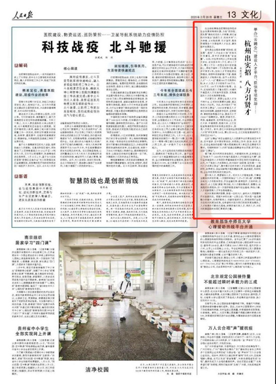 刊发《杭州出实招、八方引贤才》《云对接、云办事、云引才……开发“云服务”,杭州又先人一步》等文章,点赞此举为城市发展蓄能蓄力,是当前统筹推进疫情防控和经济社会发展特殊时期采取的特别之举。