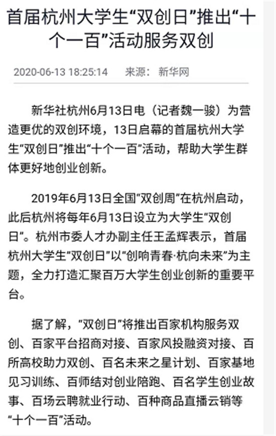 杭州将每年6月13日定为大学生“双创日”,以吸引全球大学生来杭创新创业、成就梦想,为杭州打造“重要窗口”提供人才支撑。