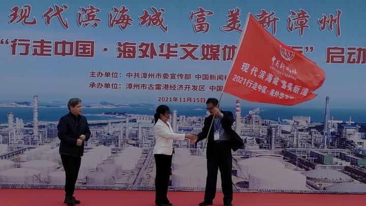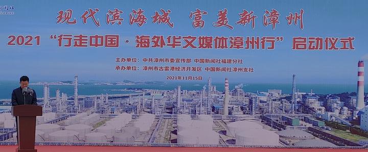 由中共漳州市委宣传部 中国新闻社福建分社主办、漳州市古雷港经济开发区 中国新闻社漳州支社承办的2021“行走中国•海外华文媒体漳州行”11月15日在福建漳州市古雷港经济开发区启动。来自13个国家19家海外华文媒体高层人士及当地媒体、古雷港经济开发区有关人员等参加了启动仪式。