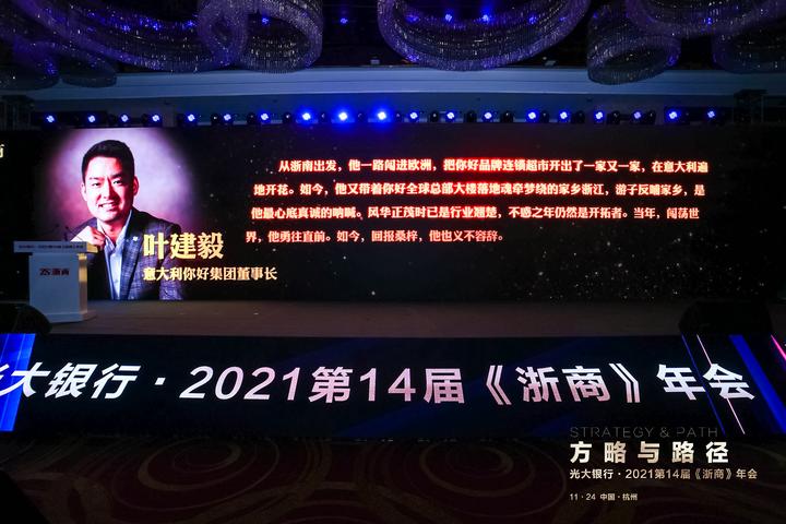 此次年会上,“2021浙商年度创新人物”榜单隆重揭晓。意大利你好集团董事长叶建毅凭借过去一年驱动创新创业发展的突出成绩,获得“2021浙商年度创新人物”称号并上台领奖。