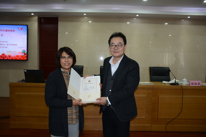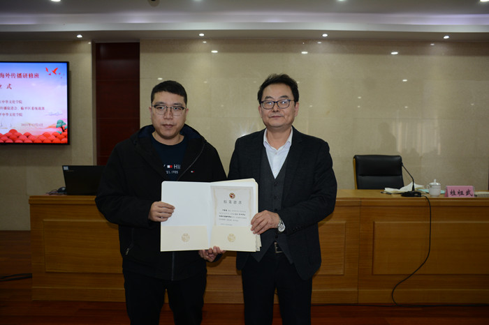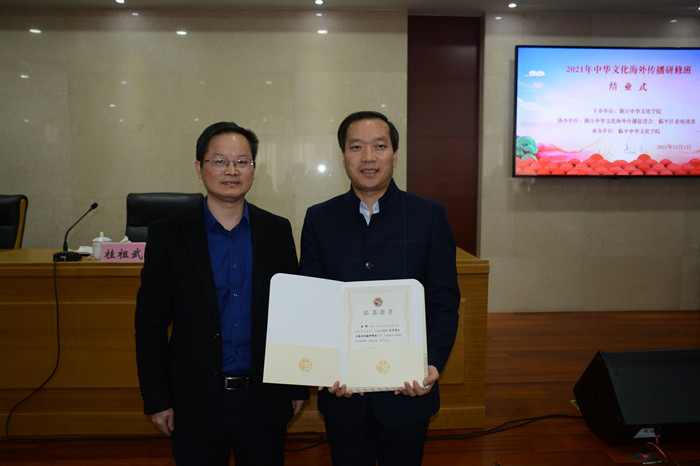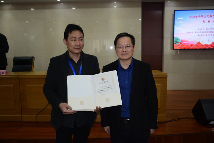 在结业式上,浙江中华文化学院文化交流处处长张建伟受学院领导委托,与临平中华文化学院常务副院长桂祖武一起为全体学员颁发了结业证书,他对学员们提了三点希望:一、放大文化格局,深刻领会“文化自信”的内涵和时代价值。希望大家以参加本次研修班为新的起点,加强文化理论知识的学习,把学习贯穿到各自的工作实践中去;二、做国际传播的积极推动者,在积极传播中华优秀文化的同时,要广泛宣介中国主张、中国智慧、中国方案,要高举人类命运共同体大旗,依托我国发展的生动实践,立足五千多年中华文明,全面阐述我国的发展观、文明观、安全观、人权观、生态观、国际秩序观和全球治理观;三、学以致用,在工作岗位上努力践行,助力“重要窗口”和高质量发展,肩负起建设共同富裕示范区的时代重任,积极引领具有跨文化教育背景的年轻一代华人华侨成为讲好中国故事、传播中国声音的前沿力量,为“一带一路”建设和构建人类命运共同体作出应有的贡献。