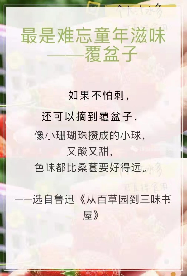 鲁迅曾在《从百草园到三味书屋》一文中描写过覆盆子,说它像小珊瑚珠攒成的小球,又酸又甜,可谓既形象又通俗易懂,这篇入选过教材的文章也是许多人对覆盆子的一个美好印象。