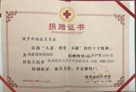 此后,随着疫情的进一步发展,全国各地医疗物资一度告急,海外采购和运输工作也遇到了重重困难。情势紧张之际,沈木辉先生再次面向俄罗斯福建总商会全体会员发出了《开展战胜新型冠状病毒感染的肺炎疫情献爱心募捐行动倡议书》,号召海外会员企业和侨领多方筹措防疫物资,用实际行动驰援祖国人民。作为表率,他带头捐赠了40多万人民币用于专项采购医用防护物资。当时,在俄罗斯购买医用防护物资并不容易,为了买到真正合格、安全、有效的物资,他在短短几天时间内安排海外工作人员及家属跑遍了当地的各大知名医疗用品生产商,收集采购医用物资渠道。随后,为了确保物资及时运送回国,他努力争取到当地政府的支援,调动所有能调动的资源,顺利完成了各项报关通关手续,终于在2月15日将2500套昂贵的医用防护服顺利送达福州长乐机场,为福建省抗击疫情贡献了极大的力量。为此,他和俄罗斯福建总商会还受到了福建省人民政府办公厅的褒奖,颁发的证书在中国华侨历史博物馆用于海外侨胞抗疫专栏展示。