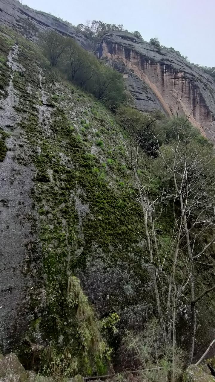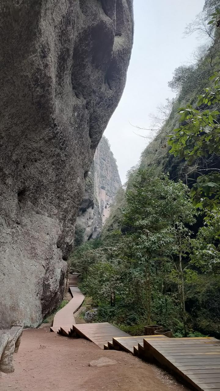 倚天峡的“时空隧道”,能同时看到和触摸到两个相隔遥远年代的地质岩层,左手边是距今约4亿年的变质岩,右手边却是距今8000万年形成的丹霞地貌地层,一水之隔,两种岩石的形成年代竟相差3亿多年。大峡谷两旁危崖突兀,壁立千仞,难得见到阳光,走入峡谷中顿生隔世之感,恍若世外桃源。