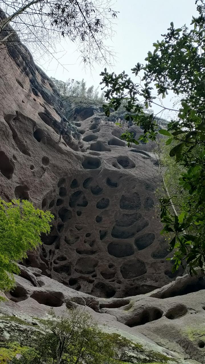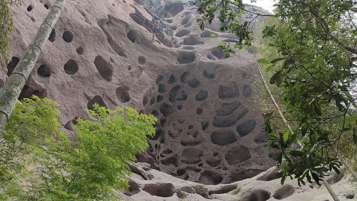 天穹岩是寨下大峡谷最引人入胜处。在一处倒悬着的红色崖壁顶端,有一直径约20米的凹岩,鬼斧神工般雕琢出数百个大小不一、形态各异的丹霞洞穴,大洞套着小洞,洞中有洞,在谷底看来宛如一座神圣殿堂的穹庐,高贵而又气派;又好似满天星斗,令人眼花缭乱。叹为观止。这就是极具丹霞特色的“天穹岩”,它是一处由水流侵蚀、风化剥蚀而形成的大型蜂窝状洞穴群,是漫长的地质演变过程中遗留下来的鲜明印迹。那一个个洞穴仿佛张开的大口,穿越亿万年的时空隧道,期待与现代人对话,回答你每一个好奇的提问。游人至此,无不驻足仰望,为这极为罕见而蔚为壮观的自然奇观拍手叫绝!