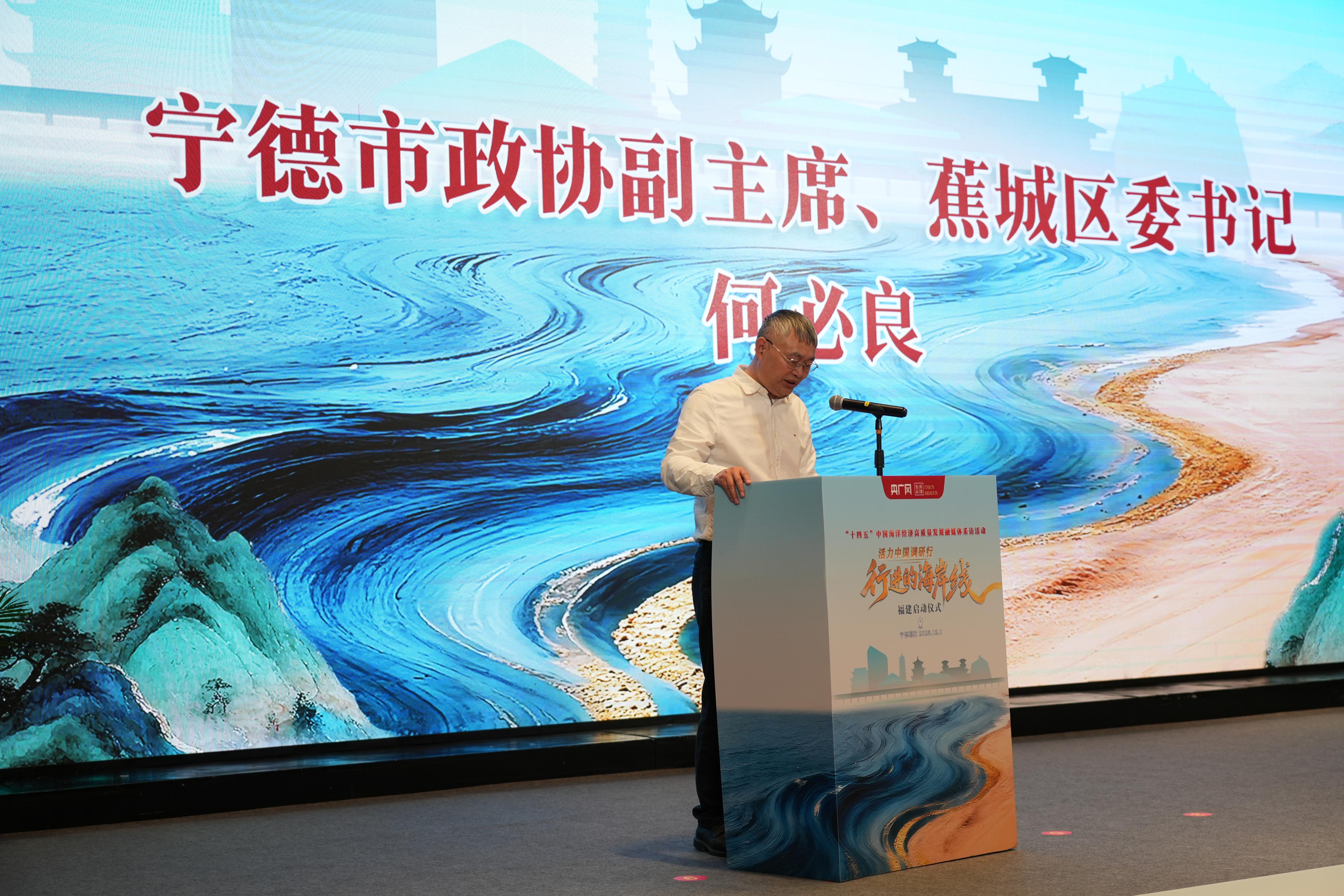 伍刚在致辞中表示,此次“行进的海岸线”大型融媒体采访活动,是央广网2025年的重点策划之一,也是落实中宣部“活力中国调研行”的重要举措。在“海洋强国”战略的指引下,央广网沿海15个地方频道的骨干记者沿着中国海岸线,采用行进式、体验式、观察式报道,讲述海洋经济高质量发展的中国故事。目前已推出了一批海洋经济高质量发展的鲜活报道,产生了热烈的社会反响。“福建海岸线居全国第二,拥有丰富的海洋资源。此次选择在福建蕉城启动,既是对蕉城以及宁德奋力推动海洋经济高质量发展成绩的集中展现,也是央广网履行媒体职责,通过央媒矩阵力量,向全国传递‘海上福建’向海图强实践的重要举措。”伍刚表示。