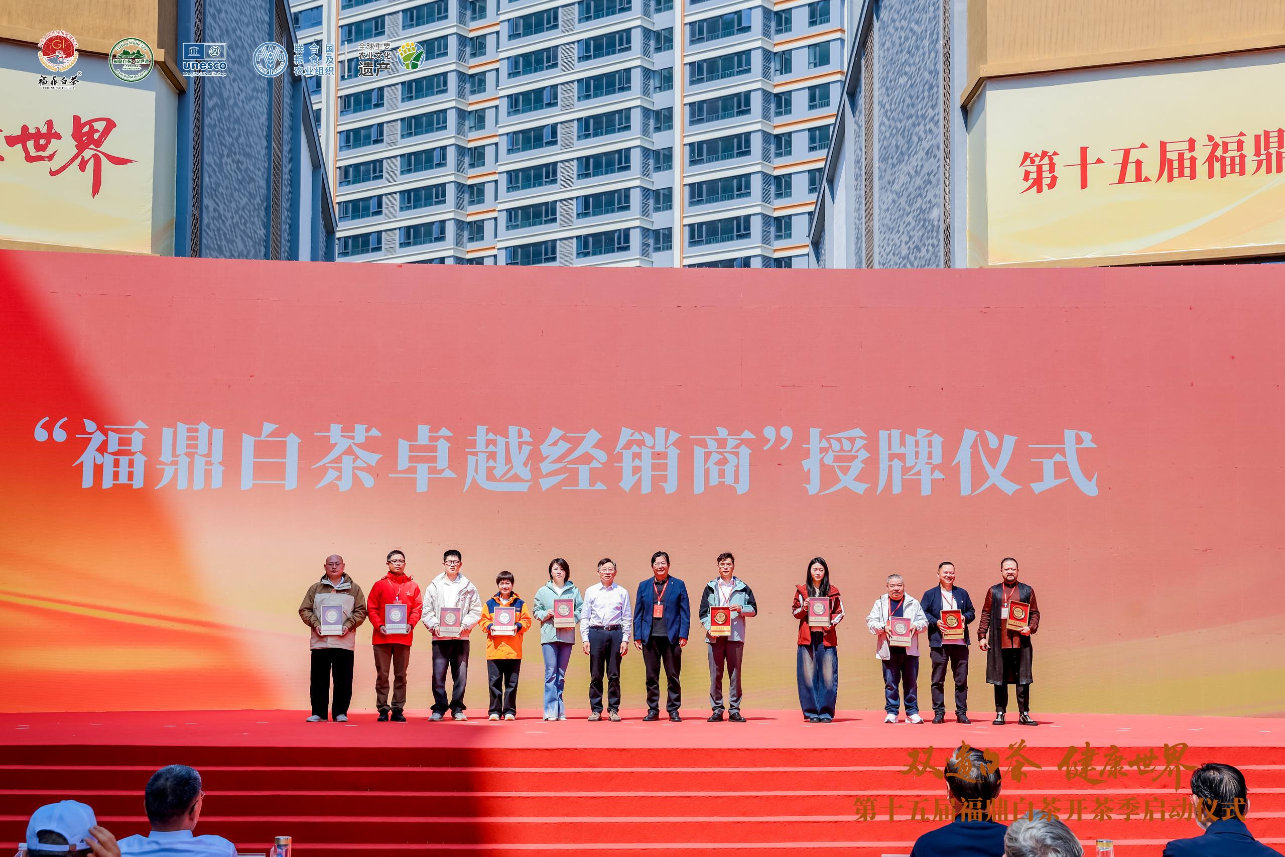 启动仪式上,发布了《福建省农业农村厅关于支持福鼎白茶产业高质量发展的试点方案》《福鼎白茶产业标准蓝皮书》《福鼎白茶产供销一体化数智供应链平台》、福鼎市精品茶旅线路。福鼎市政府分别与福建农林大学、福建省产品质量检验研究院、浪潮云洲工业互联网有限公司、杭州市人才集团有限公司、京东超市签订合作协议;品品香、绿雪芽、鼎白、裕荣香等茶企同步签约,聚焦科研、数字化、栽培技术、文旅健康等领域深化合作。现场还为23家首批 “双世遗”授权企业、20名福鼎白茶卓越及优秀经销商、10名品牌推广大使授牌。
