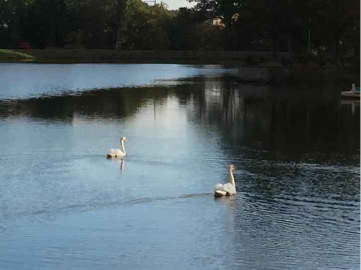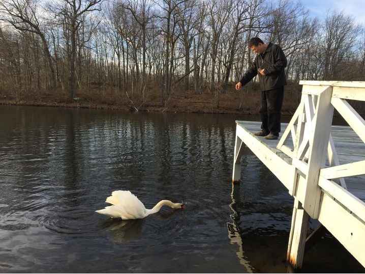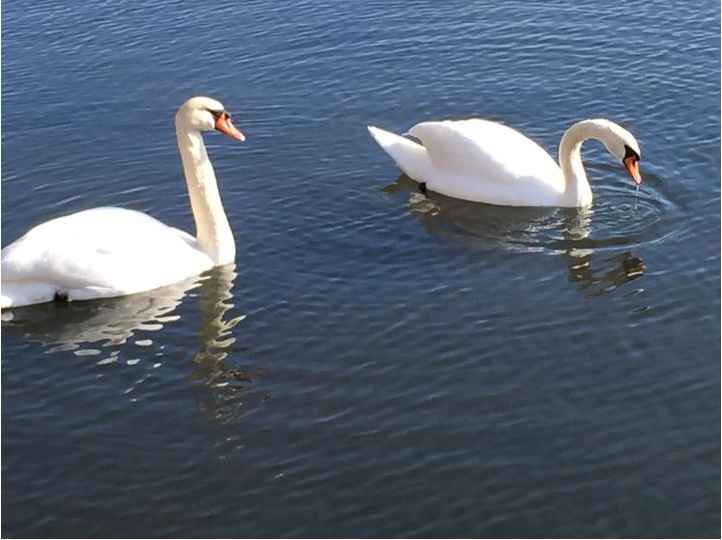 两只白天鹅慢悠悠游来,游到木台附近,就静静徘徊在那里。我痴痴望着她们,心里感叹白天鹅的美丽——天鹅无疑是天下最美的动物。天鹅的体形与色泽,是先天之美,而最美之处,在天鹅的优雅。天鹅一举一动无不优雅到极致,而且是时时刻刻展现着优雅,这种优雅又显示出高贵和神圣,是那种至高无上的高贵和不可侵犯的神圣,这让任何动物包括作为人类的我,在天鹅面前,都感到卑微和粗俗。这时,有一种力量让我不由自主站起来,到食品柜取出一个面包,打开后门,来到木台上。我撕开面包,一块一块扔到白天鹅的面前。她们镇定地望着我,仍一动不动。倒是几只野鸭扑啦啦飞跑过来,抢食水面上的面包。