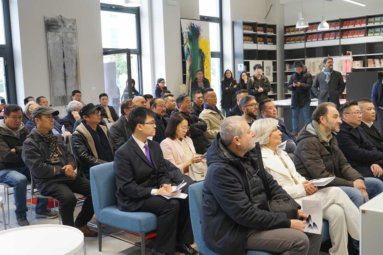 开幕仪式上,普拉托联谊会会长徐秋林在致辞中说,文明因交换而多彩,文化因互鉴而丰富。中意文明艺术的交换是一条绵延的长河,改革开放以来,中意两国艺术交换通过展览,留学以及互办文明年,艺术节等情势广泛发展,双边的互动蔚然成风。意大利意所文化艺术协会联合普拉托华人华侨联谊会和普拉托省政府共同举办的《古往今来中国的爱与孤独》艺术展时值中华人民共和国成立70周年华诞,为促进中意两国人文交往,艺术文化交流,让中意友谊不断焕发新的生机活力。“书画”作为中国传统艺术的主要形式,几百年传承创新至今,形成新的艺术语言形式。笔墨纸砚,寥寥几笔,书写的是东方深厚的文化底蕴,传承的是不屈的文人风骨。让更多的观众走近艺术,感想此处,感知别处,从而拓展了文明的交换与文明的融会。今天的中意两国艺术交换使得两国民众不再停留在远距离的文化眺望跟假想中,而是获得近距离的文明凝视与欣赏,由此增加了心灵的交流与沟通。