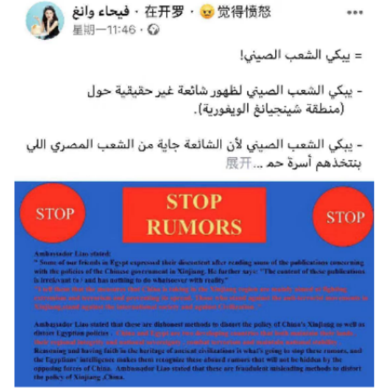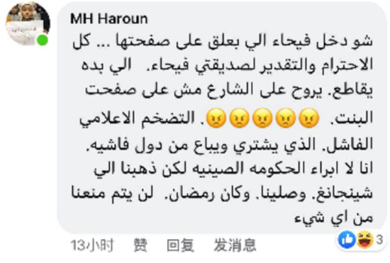 △埃及国家电视台著名记者Ibrahim Amin Abaza在自己的脸书账号上发帖:“这是破坏中国与阿拉伯国家、伊斯兰国家友好关系的谣言——请看我的中国朋友王馨对此问题的阐述。”