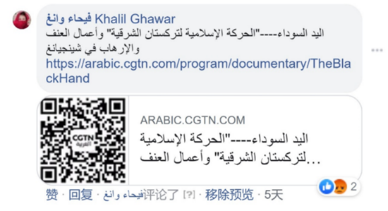 △王馨脸书留言:有关反恐,请看CGTN纪录片《幕后黑手——“东伊运”与新疆暴恐》。