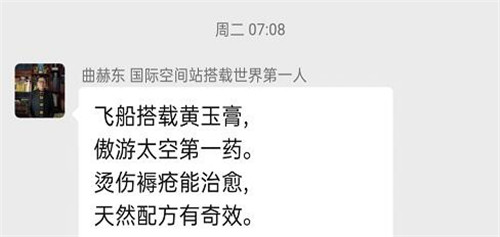 此次飞船搭载的作品稀少珍贵,能入选的医药产品也是寥寥无几。因此得到了俄罗斯国际空间站搭载书画世界第一人曲赫东老师的盛赞,为“黄玉膏”的壮举和产品质量,题诗一首: