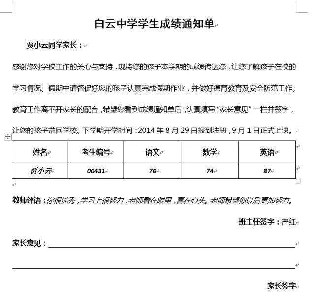 最终的效果是得到每个学生的成绩通知单,如下图所示: