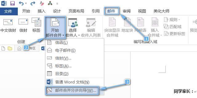 1.打开邮件合并分步向导。依次单击“邮件”--“开始邮件合并”--“邮件合并分步向导”。