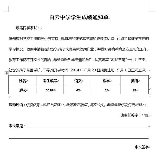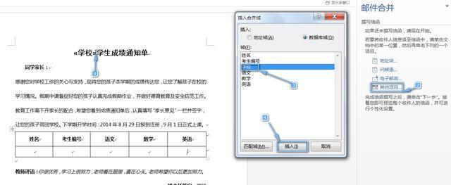 然后再将光标定位在“同学家长前面”--单击“其他项目”--“学校”--确定--关闭,以同样的方法设置成绩通知单中的表格包括姓名、编号、语文、数学等。如下图所示: