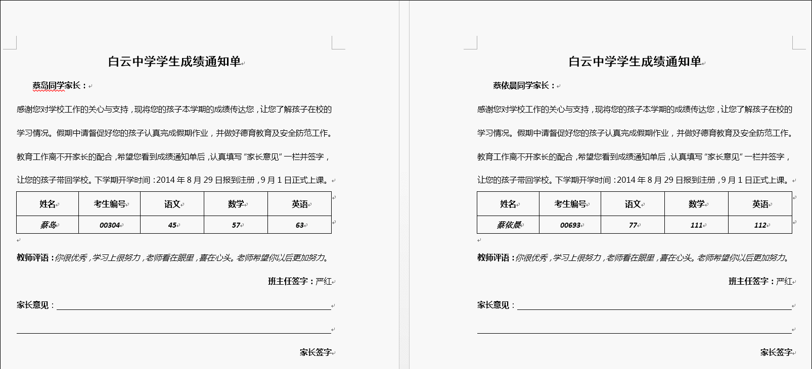 6.单击“编辑单个信函”--全部--确定。我们就可以得到每个人的成绩通知单了,直接保存文档然后打印出来,分发给每个家长就可以了。如下图所示: