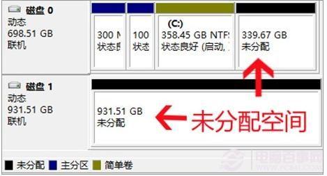 在执行组建操作前,我们必须确保两块硬盘都有足够未分配的空间可供使用(也就是有未执行分区和格式化操作的空闲分区),否则在下一步的组建过程中,鼠标右键点击硬盘将不会出现“新建带区卷”(相当于RAID0)或“新建镜像卷”(相当于RAID1)等选项,导致操作无法继续。