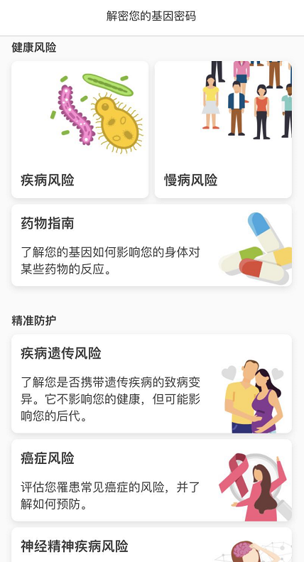 很多慢性病靠医疗设备很难察觉,靠圆基因检测可以了解是否携带疾病的致病变异。也可以大大降低“疾病遗传风险”“癌症风险”“神经精神疾病风险”等隐患!