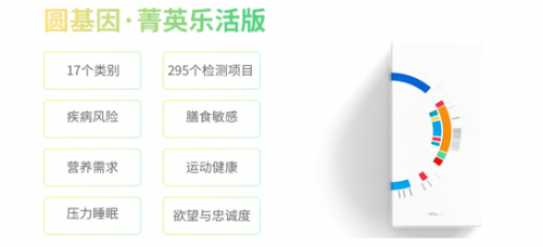 圆基因让更多消费者有机会接触并且受益于基因检测前沿科技。通过解密基因信息,圆基因可为消费者提供500项报告内容,更精准的掌握用户健康状况,向用户提供对于遗传特征、癌症风险、疾病遗传风险、疾病风险,膳食敏感、污染敏感、药物指南、营养需求、身体特征、行为特征等健康数据,以百种数据权威报告引导消费者优化膳食结构,提供用药指导,避免危害健康行为。