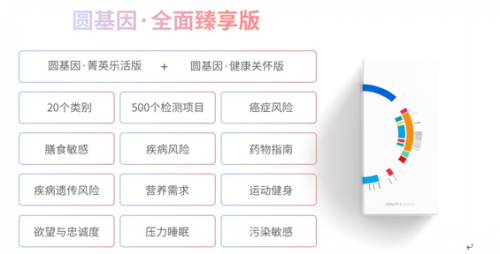 圆基因全网首发的三款产品,分别是经济实惠的菁英乐活版、癌症和神经精神检测类的健康关怀版、以及最为全面详细的全面臻享版。三款不同价位和服务,满足了不同用户的多种需求。