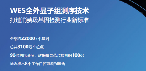 作为二代基因检测技术,与芯片检测相比,WES技术能够直接发现遗传变异,测序程度更深,数据更有效,检测更准确。WES全外显子组测序技术打造出了消费级基因检测行业新标准:WES可检测全部约22000+个基因总共3100万个位点,90倍测序深度,数据是是芯片检测的100倍!而且出具权威报告时效更短,接收样本8个工作日即可看到。