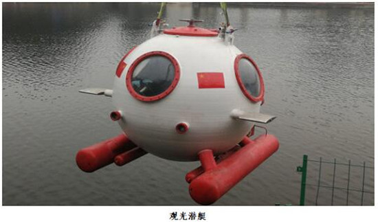 随着浮管式水力发电机的开发,重庆同利还研发了一款副产品,它就是观光潜艇。观光潜艇原本叫水下机器人,用于浮管式水力发电机的安装维护保养。考虑到前期积累经验和后期需加装机械手,固积累经验的初期就叫观光潜艇。观光潜艇外观设计得比较卡通、科幻。一则为了吸引广大旅游爱好者;二则是圆形好加装机械手,而且便于操作便于观察。观光潜艇乘员5人,其中驾驶员一人;下潜深度10米(考虑安全和10以下光线太暗)。可使用于:旅游观光,安保巡逻。