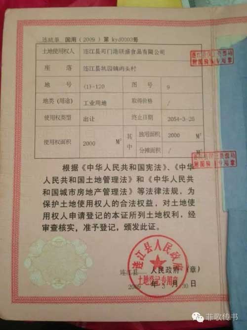 为响应党和国家招商引资政策的号召,美籍华侨郑碧钗女士便回乡,在连江县坑园镇屿头村井上路106号开办了“连江县可门港联盛水产品有限公司”,相应的营业执照、用地规划许可证、国有土地使用证等合法手续一应俱全。