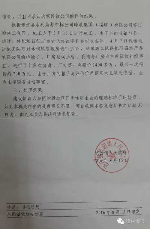 据镇政府回复:根据连江县水利局与(项目)中标公司晔晨集团签订的施工合同,施工方于3月16日进行施工,由于当时我镇与另一拆迁户林积焕就征迁事宜已经谈妥具备拆除条件,4月7日我镇通知施工队可对林积焕管理房进行拆除,结果施工队误把联盛水产品有限公司给拆除了。厂房被误拆后,我镇与厂房业主就征收补偿事宜,进行了十多次协商,厂方第一次报价1400多万,最后一次报价约700万元。由于厂方的报价与评估价差距巨大且缺乏依据,至今未能谈妥补偿事宜。