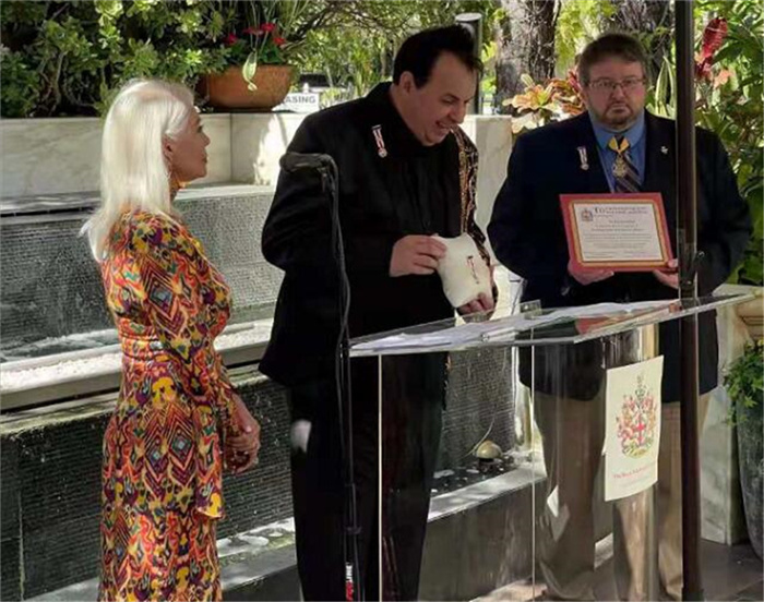 美国当地时间4月7日中午,比佛利山庄四季酒店举办了“国际知名艺术家黄建南先生荣获英国皇家学会荣誉会员”的授勋仪式。授勋仪式(上图)严格按英国皇家学会(RSSG)荣誉会员127年传统方式进行。