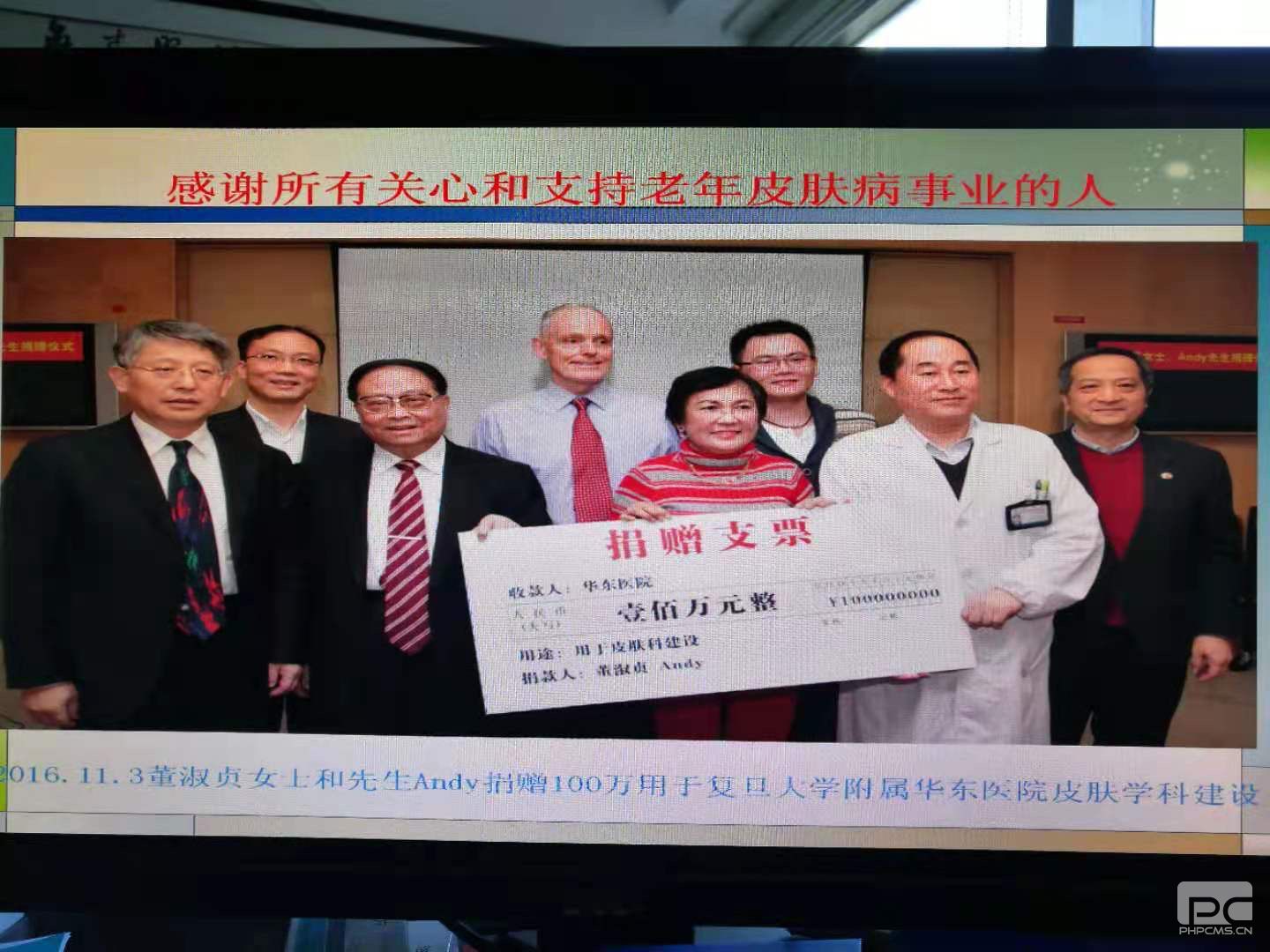 2016年11月3日, 董淑贞与先生Andy 向复旦大学附属华东医院捐赠一百万人民币, 用于皮肤学科建设。