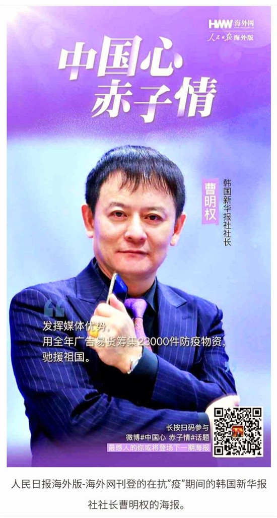2018年12月22日,身为韩国新华报社社长、全国韩籍华人总联合会总会长曹明权,被韩国新闻记者协会评选为2018年度韩国新闻记者功勋大奖荣誉称号。