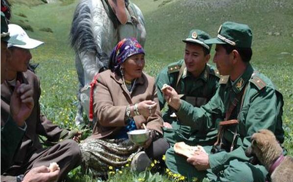 这块雪域高原虽气候寒冷,但人情温暖。爷爷作为兵团戍边战士常常会给我讲起许多军民之间可歌可泣的感人故事,我也渐渐成为了这些故事的参与者。每年到了夏季牧场,我都会有一个特殊任务,就是爬到牧点后方的山顶,观察巡边士兵是否已结束任务按时返回。当然,不能按时返回的次数远高于前者。一次巡逻就是一个星期,交通工具只有马匹,多数情况下,马匹也只是用来运输食物,官兵们更多的会选择步行,这样他们的脚就不会被冻坏。如果出现了护边官兵的影子,我就传信号给山脚下的4户人家。告诉他们,巡边官兵大概到了什么位置,有时遇到暴雪天气无法睁开眼睛远眺,母亲会给我准备黑色的羊毛作为特殊的“墨镜”,这样眼睛就不会受到伤害,还能看的更远、更清楚。山脚下的牧民收到信号后就会立即给巡边官兵准备食宿,无论家里有多少食物,勤劳的母亲们“你”出白菜、“我”出西红柿、“他”出肉的能准备一桌最好的饭菜,招待巡边归来的官兵们,从来不会让官兵们察觉到其实自己几乎没什么食物了。