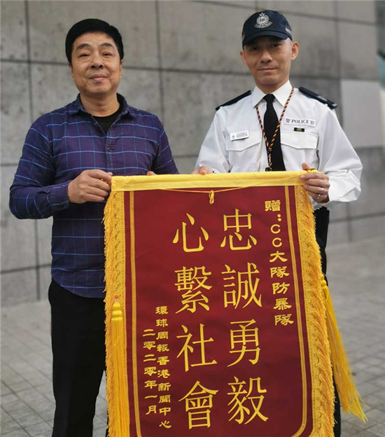 环球周报香港新闻中心赠锦旗:cc大队防暴队———忠诚勇敢 心系社会