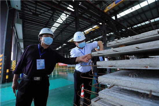 四川成都,两位海外华文媒体代表在观看半成品的预制板。王磊 摄